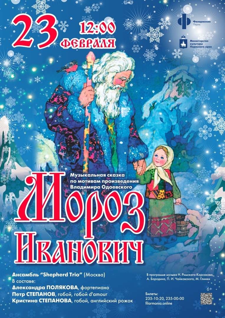 The premiere of the musical winter fairy tale "Moroz Ivanovich" was prepared by talented musicians "SHEPHERD TRIO" (translated from English as "shepherd trio"). Artistic word - actor of drama theater and cinema, Sergey Stepanov. The ensemble "Shepherd trio" includes laureates of all-Russian and international competitions, musicians of the Moscow State Conservatory. P.I. Tchaikovsky, performing in prestigious concert halls - Pyotr STEPANOV (oboe, oboe d'amour or oboe of love), Kristina STEPANOVA (oboe, English horn) and Alexandra POLYAKOVA (piano).