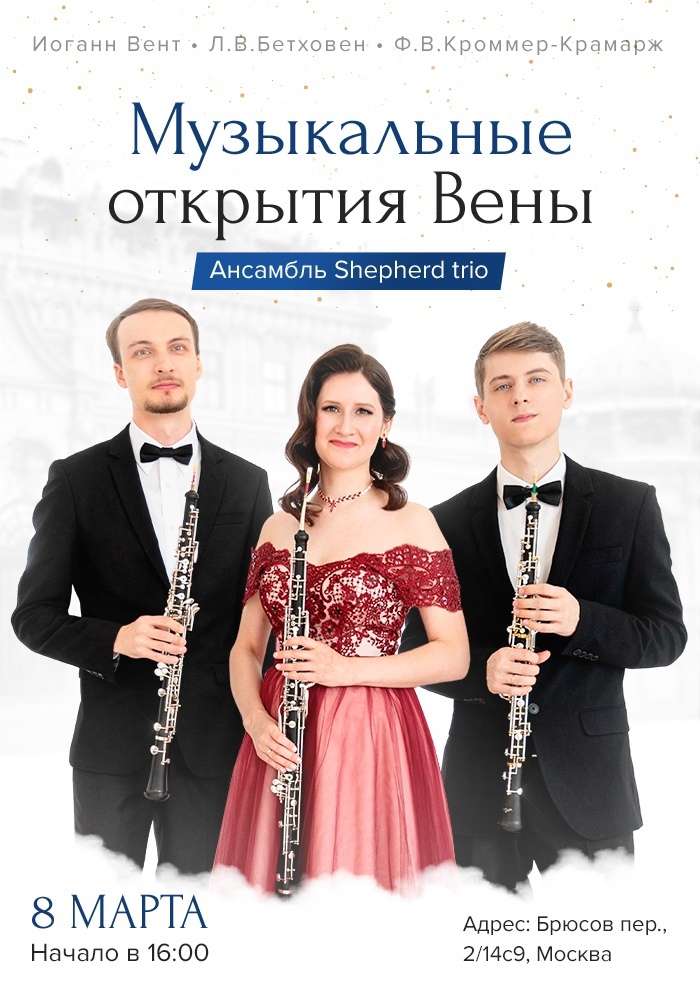 Ансамбль гобоистов "Shepherd trio" представляет новый инструментальный состав и концертную программу "Музыкальные открытия Вены". Знатоков и любителей музыки ожидают ценные сочинения эпохи классицизма, которые прозвучат в новых для них тембральных красках. Вниманию широкой публики будут представлены трио для двух гобоев и английского рожка. Откроет концертную программу Дивертисмент си бемоль мажор чешского композитора и гобоиста Иоганна Вента (1745-1801). История приписывает ему создание первого сочинения для двух гобоев и английского рожка (приблизительно 1780-е годы). На премьерном исполнении этой музыки присутствовал Людвиг ван Бетховен, под вдохновением от свежего звучания духовых он сочинил трио для двух гобоев и английского рожка до мажор оп.87 (1795) и вариации на тему 'Là ci darem la mano' из оперы "Дон Жуан" Моцарта (1797). Они были написаны в юном возрасте и спустя много лет не переставали ему нравится. В заключении концерта музыканты "Shepherd trio" исполнят задорное трио для двух гобоев и английского рожка фа мажор (1794) чешского композитора Франца Кроммера (1759-1831). Самый любимый фортуной капельмейстер в Вене, ему сопутствовали общественное признание и успех, чего было трудно достичь в городе, где музыка звучала повсюду. Вена была центром музыкальной жизни Европы, городом, куда съезжались лучшие музыканты, творили великие композиторы, прошли становление виды камерного инструментального ансамбля — трио, квартет, квинтет. Прекрасная музыка для классического трио гобоев сохранилась до наших времен и миссия "Shepherd trio" открыть ее людям и привлечь внимание к духовым инструментам. Чистые гармонии музыки классицизма, выточенные формы и изысканные мелодии перенесут воображение слушателей в дворцовые интерьеры, наполненные величественной неспешностью, гармонией и созерцанием.